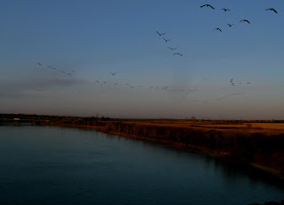 I ran 5 miles (878.5 miles) late this afternoon. It was a beautiful day for running and as I ran across the train bridge groups of Canadian geese were taking off from the river. As they flew over it felt like they were so close that I could reach up and touch them. I snapped a bunch of pictures; what a beautiful wondrous sight. In a couple weeks the geese will have all left for warmer southern weather. We have had hundreds of geese on the river the past few weeks. I don't remember noticing them last year because I wasn't running outside very much in November. It has been wonderful seeing them everyday and today's view of them flying over was spectacular.